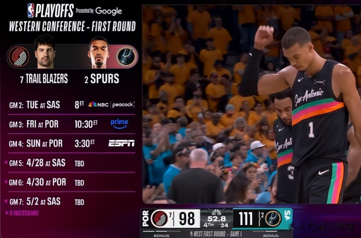 易边再战,开拓者开局打出10-2的攻击波,将分差追至仅剩2分,尚帕尼和瓦塞尔接连命中三分帮助马刺稳住局面。之后马刺越战越勇,卡斯尔持续冲击内线造犯规罚球得分,分差再度拉开到两位数。三节尾声,格兰特压哨突破上篮得分,开拓者落后15分进入末节。末节决战,马刺率先发力将领先优势扩大到20分以上,尽管开拓者在亨德森和格兰特带领下全力反扑,马刺始终将分差维持在10分左右,比赛悬念逐渐消失。最后53秒,杨瀚森获得出场机会,未能在数据上有所斩获。全场战罢,马刺111-98战胜开拓者,大比分1-0领先。
